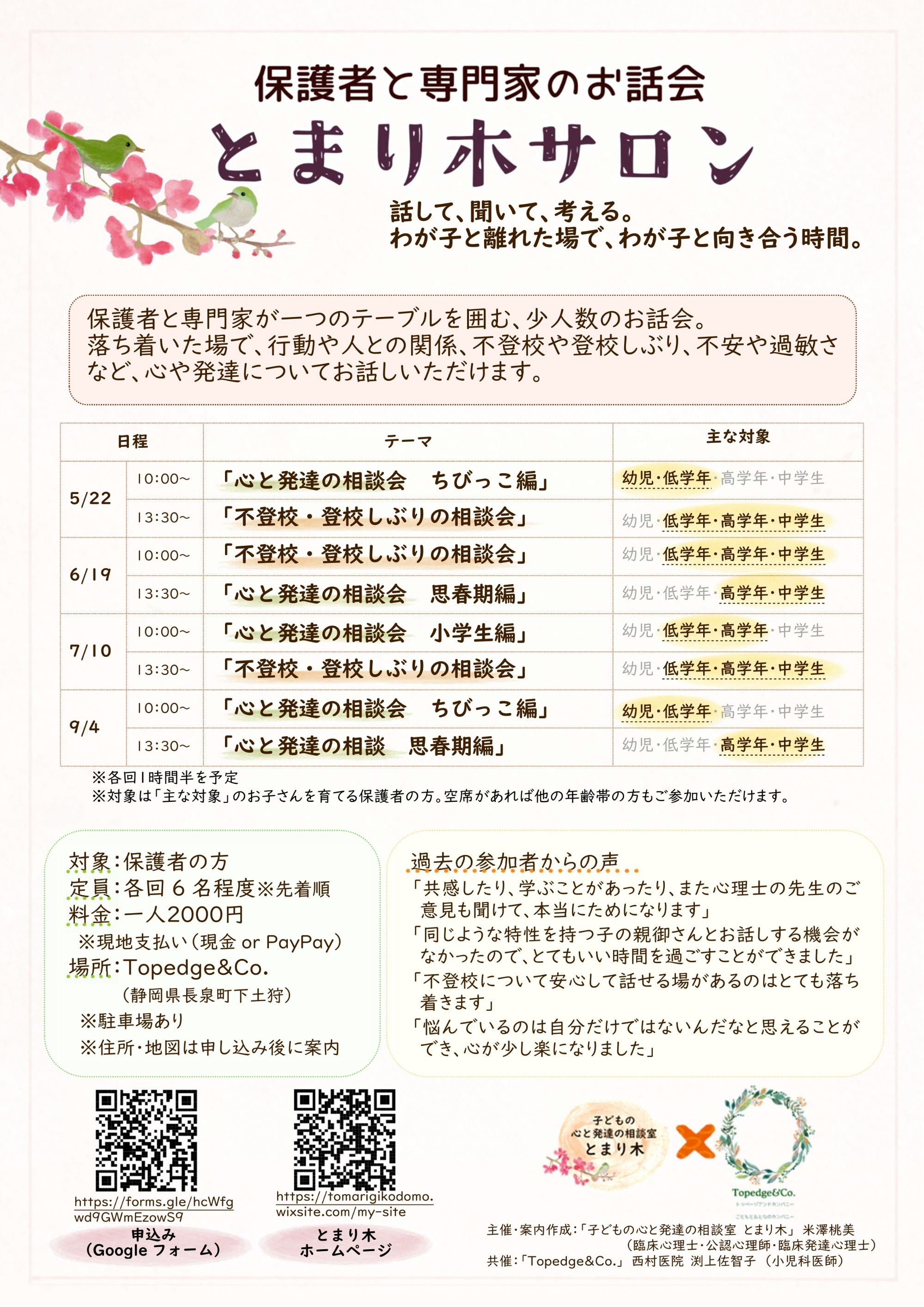 まずは心理士(「子どもの心と発達の相談室 _とまり木」米澤桃美)と小児科医師(「西村医院」渕上佐智子)が一緒にサロンをひらきます。